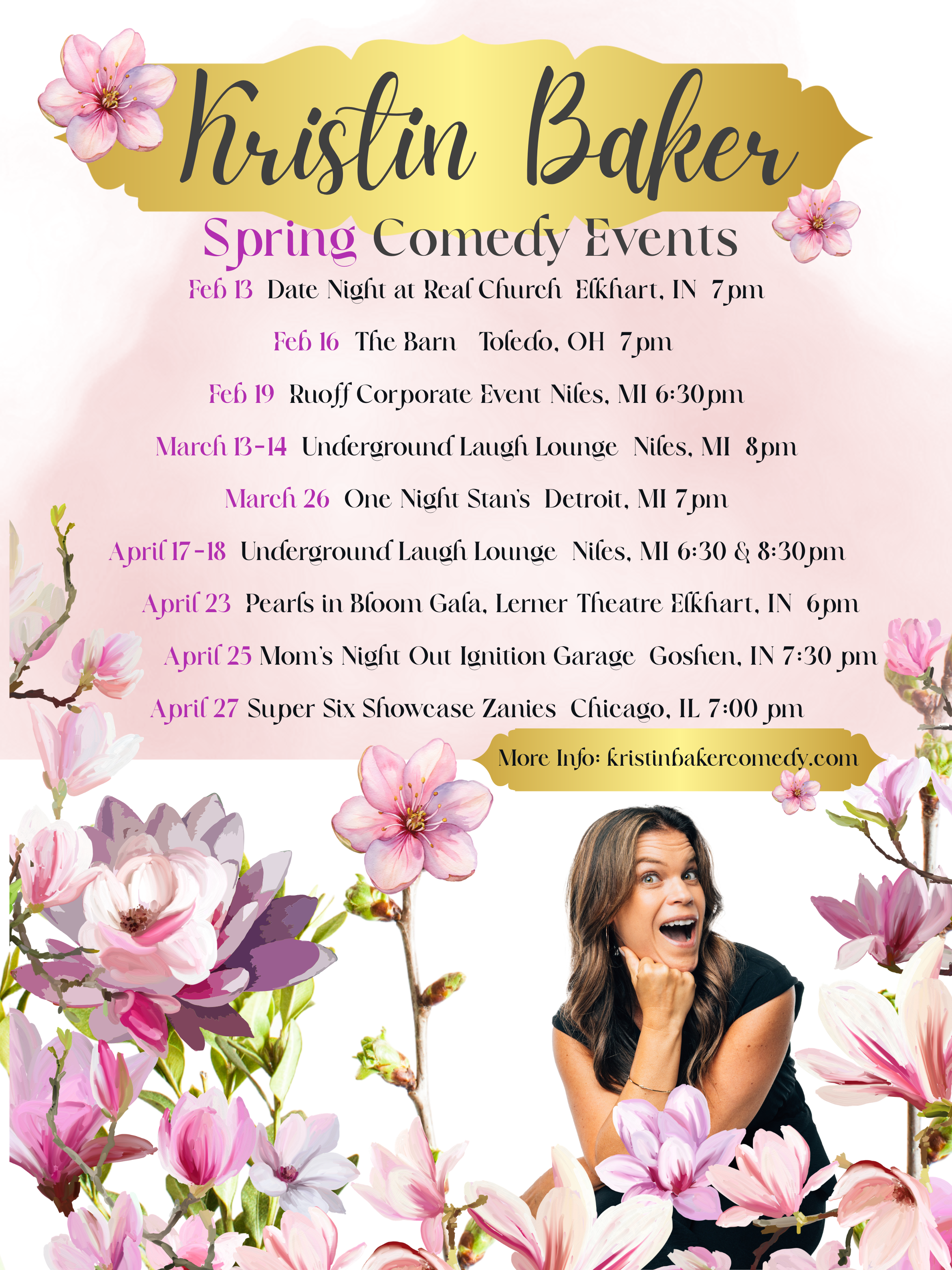 Kristin opened for Etta May, Andy Beningo, and Drew Davis at the Underground Laugh Lounge in Niles, MI, was a Clean Comedy Contest top 3 Finalist at the Funny Pharm in Goshen, IN and was the winner of the Comedy Deli Contest at the Bristol Opera House in Bristol, IN. Kristin has featured several 20-30 min sets for multiple “Comedy with a Mission” shows in the Michiana area. She is set to perform at Zanies Chicago in April and One Night Stans in Detroit in March. Kristin is a part of the all-women clean comedy team “Praises and Punchlines,” an improv artist for Comedy Deli, and is on the MC Hosting Core Team at the Underground Laugh Lounge in Niles, MI. Kristin is a certified Clean Comedy Collective comedian ready to bring the funny to your next event.